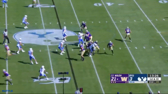 Check out how well big Jaxson Kirkland pulls from his RG position. He moves really well for a RG. The block he delivers isn’t a crusher, but it is more than sufficient. Wattenberg and Harris also do a great job on their double team of the BYU Nose. I’d like to see Watty climb to the second level a beat earlier though. If he had, he could have definitively cut off BYU’s #49 (who eventually made the tackle) instead of just getting a little one hand chip on him. But that’s a nitpick.