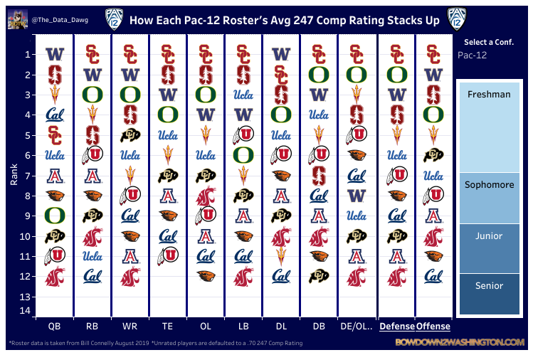 What is lower than the average DE/OLB/Rush on the roster? The average DE/OLB/Rush ratings for the upperclassman. This is dynamic is repeated across most of the position groups on Washington’s roster (though one should note that NFL early entries naturally depress the Senior ratings). Despite having a top ranked defense year after year, the raw talent on the defense in the Junior and Senior class rank 6th in the PAC-12. It’s interesting to imagine how good the defense would have been if the Huskies had been recruiting at the current level 4 years ago.